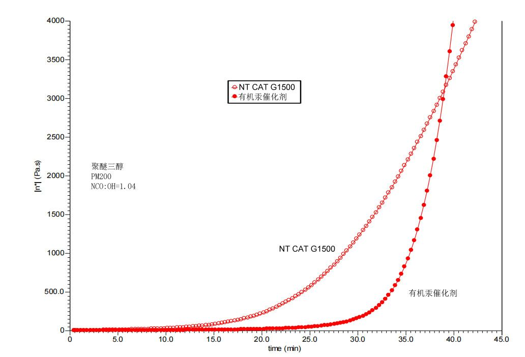 本產(chǎn)品針對聚氨酯case領(lǐng)域產(chǎn)品而開發(fā),提供類似于汞催化劑的凝膠時(shí)間和固化性能,實(shí)驗(yàn)曲線對比圖如下: