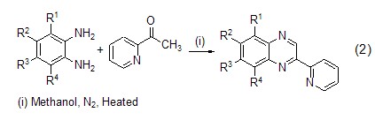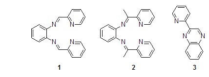 鄰二胺與2-吡啶甲醛反應(yīng)時(shí)得到的是n4席夫堿配體1[1],但是當(dāng)把2-吡啶甲醛換成2-乙?;拎r(shí),以氯甲酸甲酯為催化劑,在異丙醇中反應(yīng)沒(méi)有得到相應(yīng)的n4席夫堿配體2,而是得到了并六元環(huán)產(chǎn)物即2-(2′-吡啶基)喹喔啉3[2]。