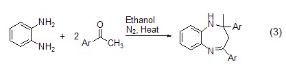 利用鄰二胺及其衍生物與2-乙?;拎樵?,以對(duì)磺酸為催化劑,在甲醇溶劑中,加熱 (50~60 oc) 攪拌反應(yīng)10~20 h卻得到了并六元環(huán)產(chǎn)物 (式2)[4,5]。